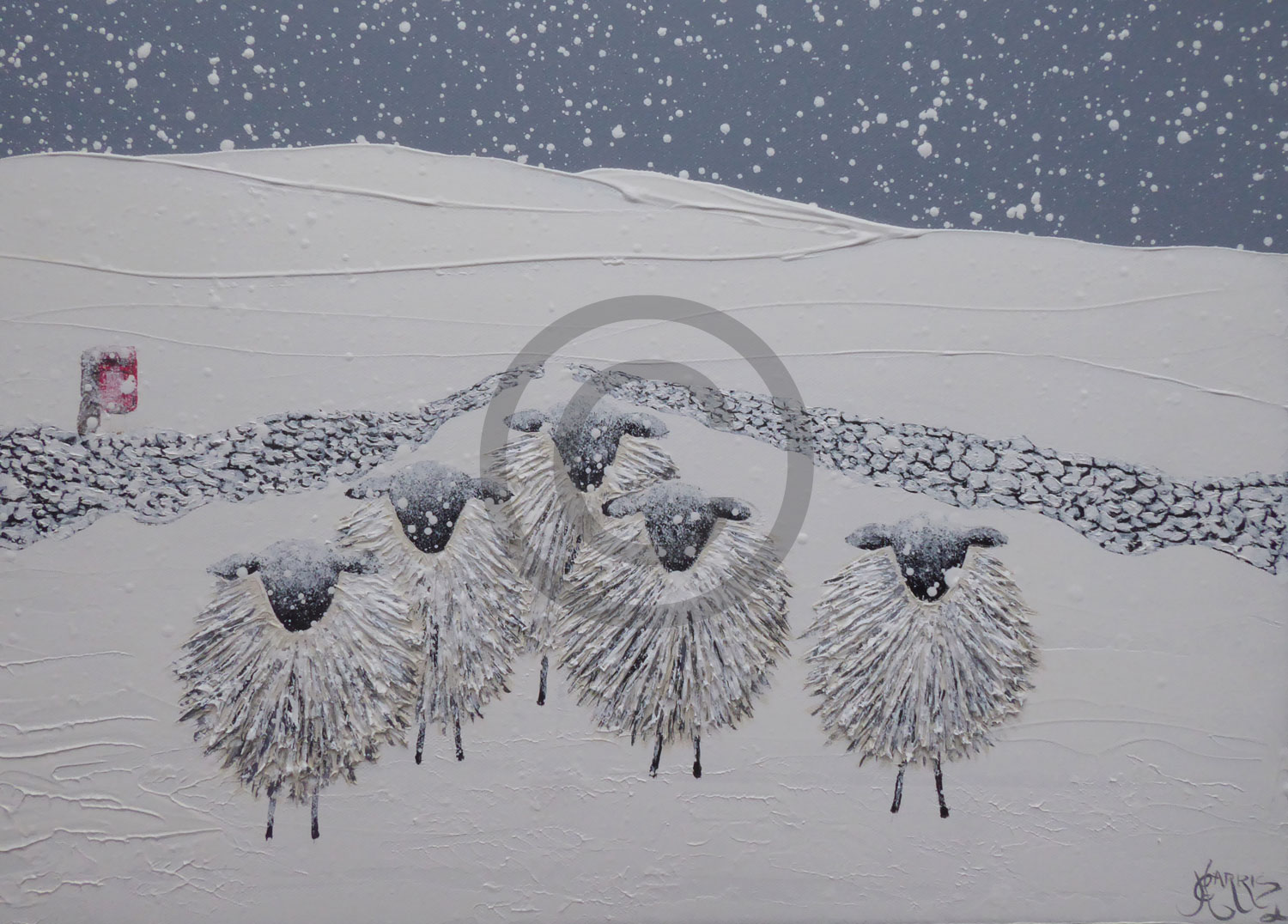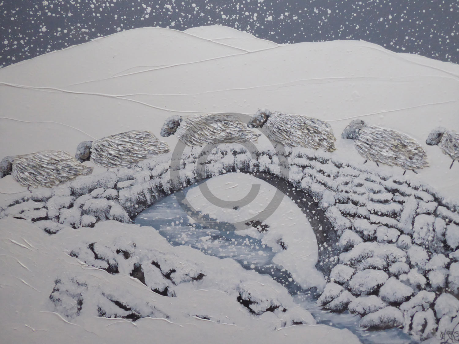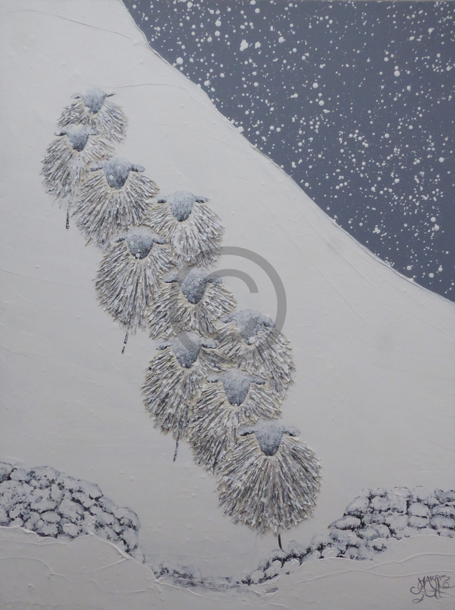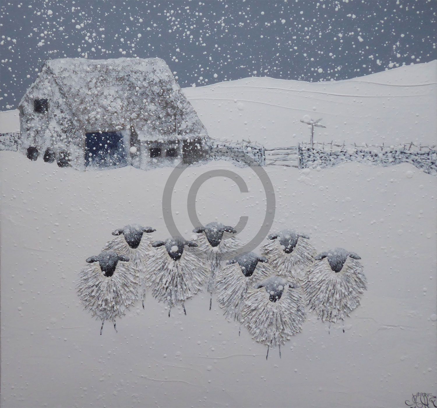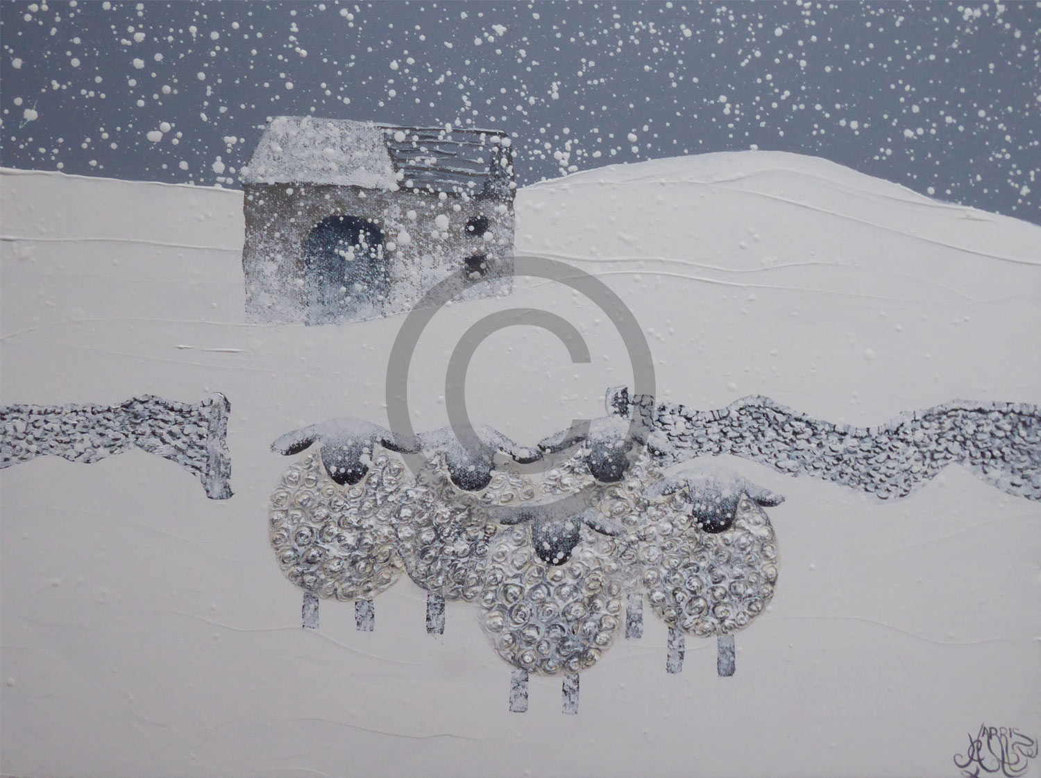 In my work I use paint to create texture of the depth of fleece found in many breeds of sheep, whilst the simplicity of a predominantly white background emphasises the loneliness of the winter landscape we once knew.