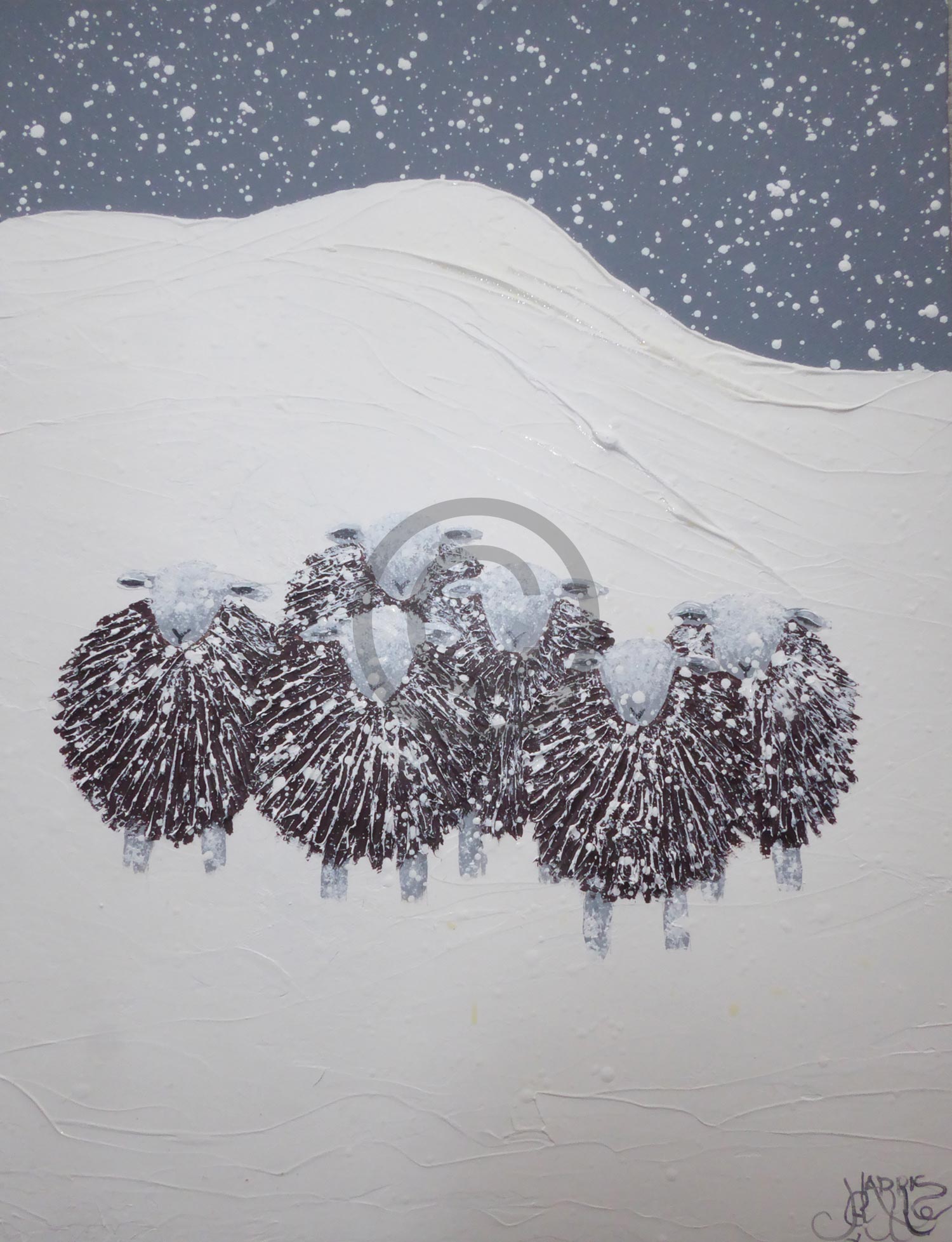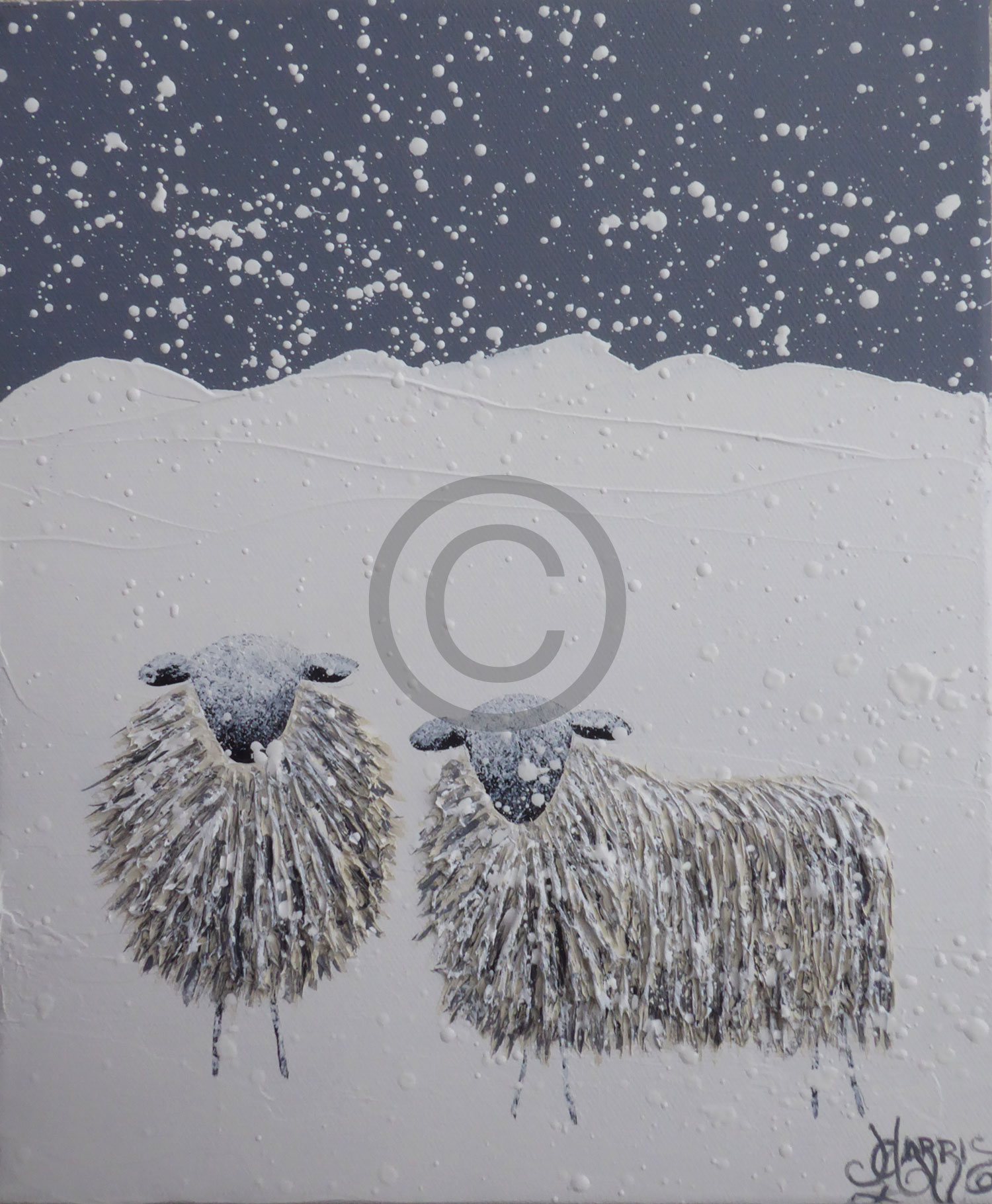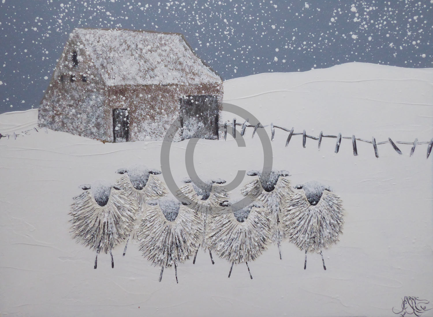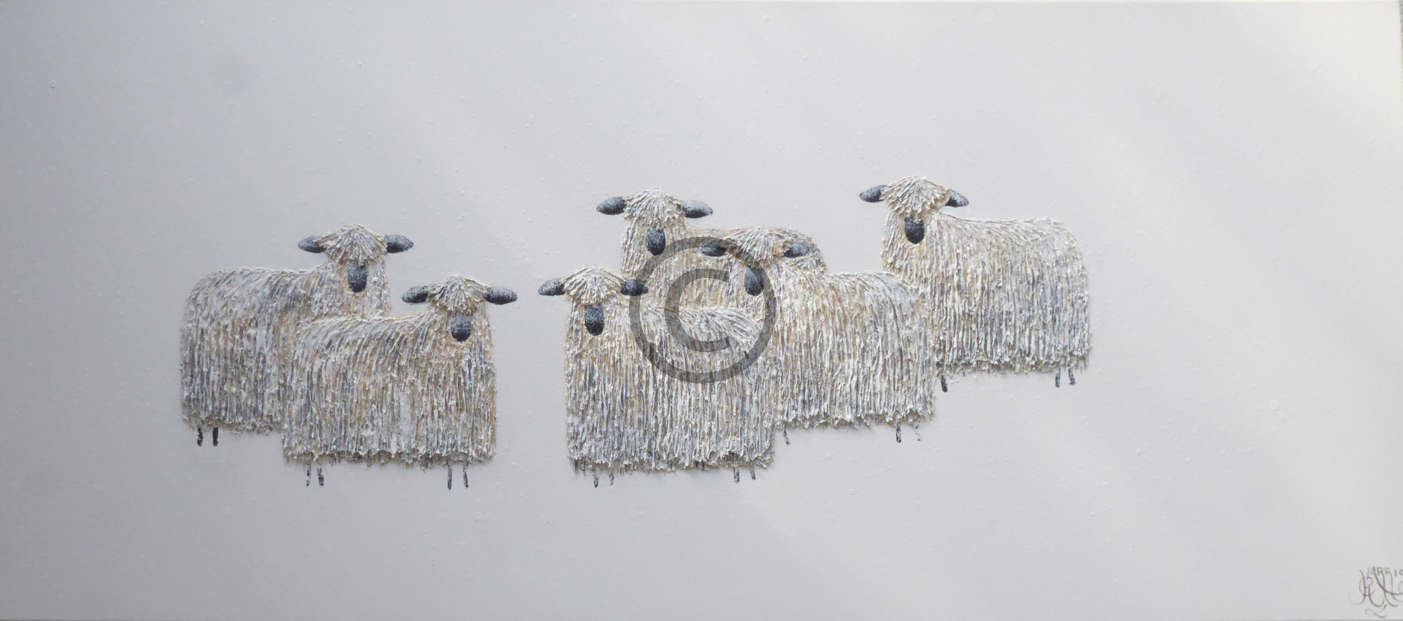 In my work I use paint to create texture of the depth of fleece found in many breeds of sheep, whilst the simplicity of a predominantly white background emphasises the loneliness of the winter landscape we once knew.