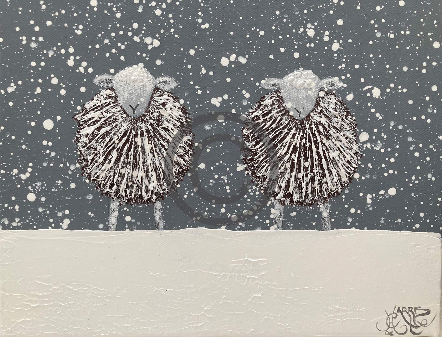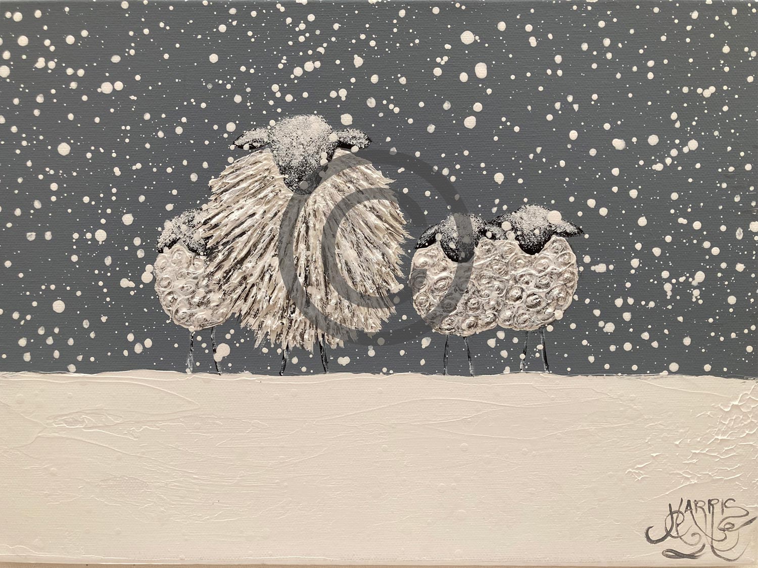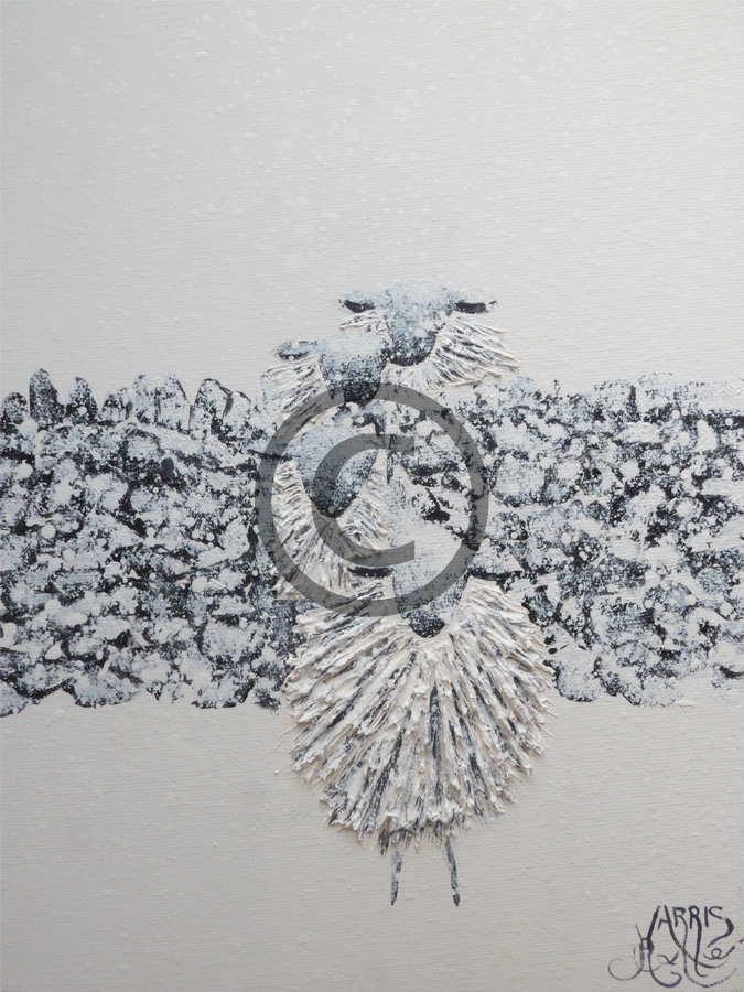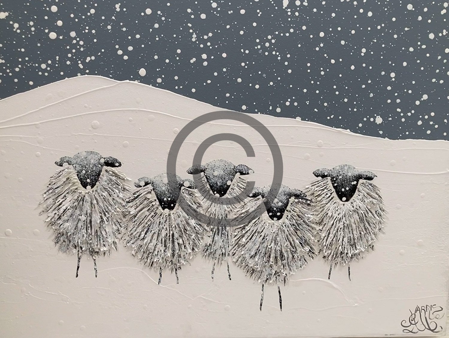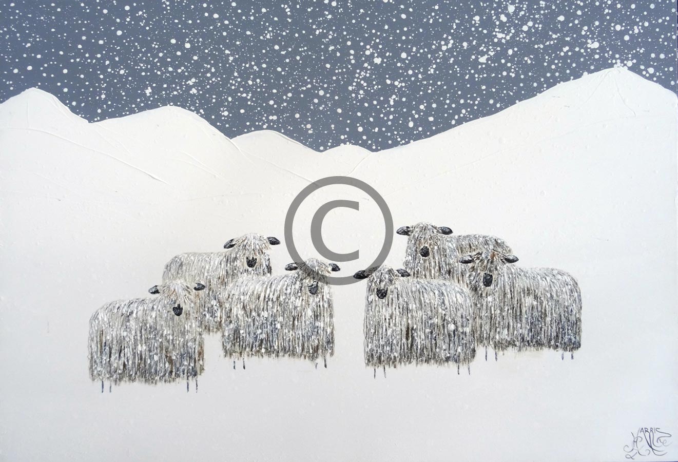 In my work I use paint to create texture of the depth of fleece found in many breeds of sheep, whilst the simplicity of a predominantly white background emphasises the loneliness of the winter landscape we once knew.